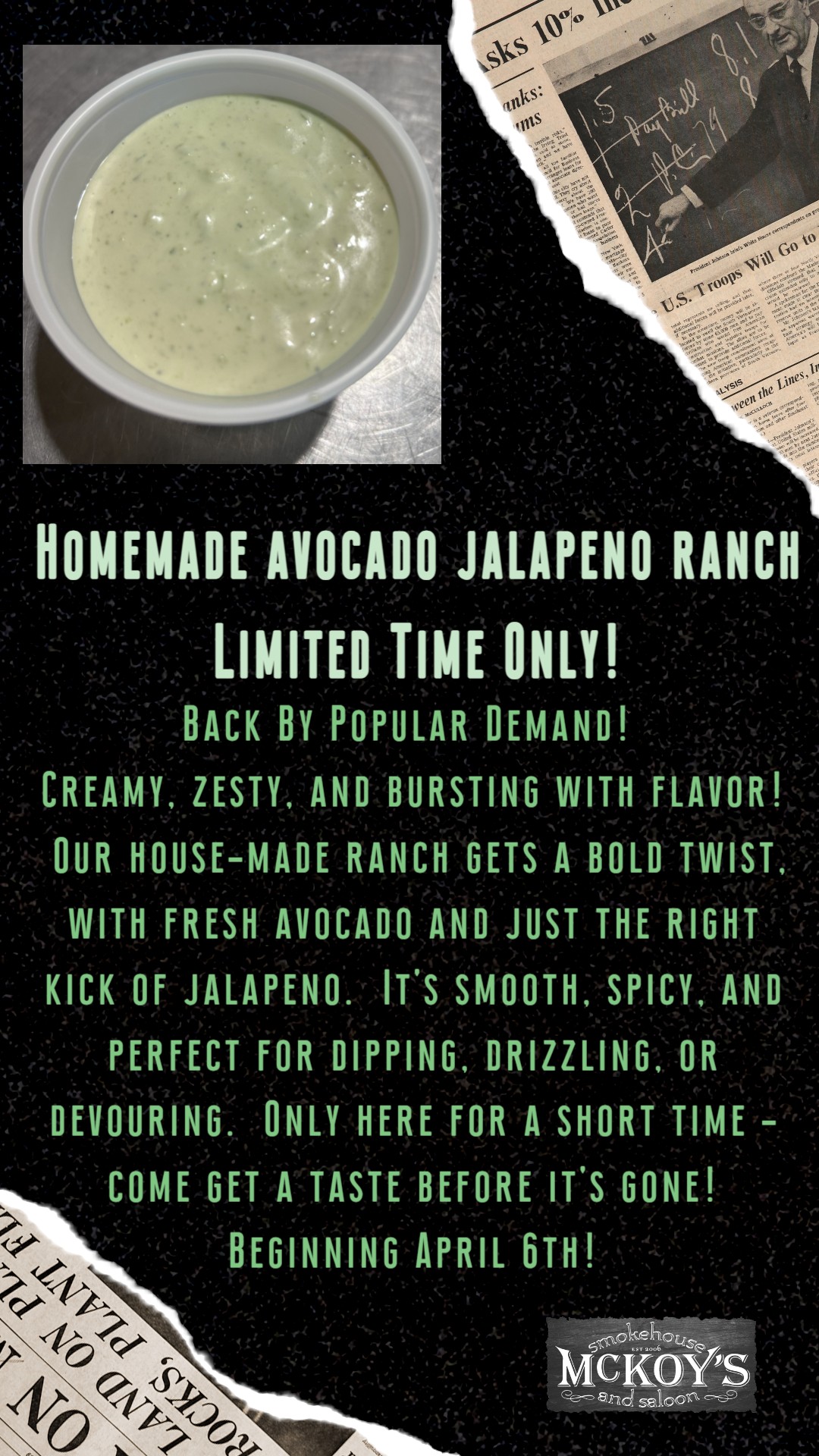 Back By Popular Demand! Our House made Avocado Jalapeno Ranch For a Limited Time only beginning April 6th!