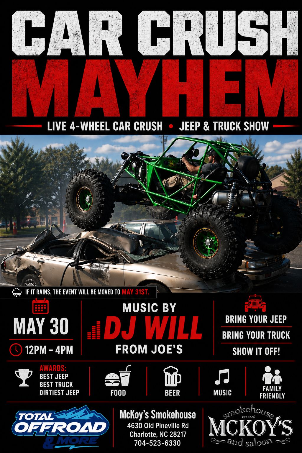 Back By Popular Demand 2nd Annual 4wheel Car Crush in our Parking Lot! May 30, 2026 from 12-5 PM Rain date will be May 31st Check our Facebook and Instagram for more information